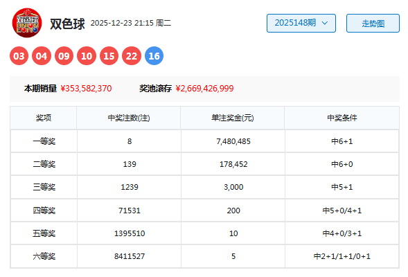 双色球25148期开奖,本期奖号红球03 04 09 10 15 22;蓝球16。当期红球号码大小比为2:4,三区比为4:2:0,奇偶比为3:3。形态方面,红球开出连号03 04和09 10;开出2枚重号03 22。蓝球开出遗漏5期的大偶数16。