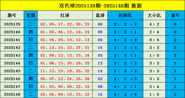 红球重号分析:上期开出2个重号,近九期开奖中出现8期重号,开出比例为88.9%,本期预计重号不会现身。