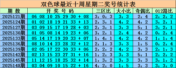 三区间分布分析:上周二第25148期奖号为:03、04、09、10、15、22+16,区间比为4:2:0。本期热区关注红一区,防三区断区,区间比关注4:2:0。