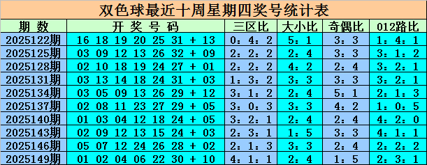 三区间分布分析:上周四第25149期奖号为:01、02、04、06、22、30+10,区间比为4:1:1。本期热区关注红二区,关注区间比:1:3:2。