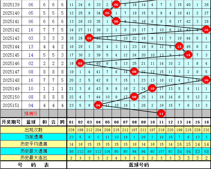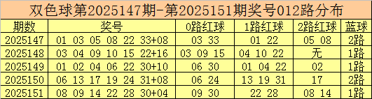 开奖回顾:双色球第2025151期开出奖号:08 09 14 22 28 30 + 04。其中,红球号码012路比为2:2:2,其中012路号码开出个数相等。蓝球号码为1路号码。