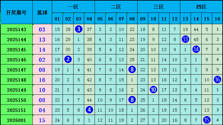 蓝球:前10期蓝球分别为:03 13 14 02 08 16 10 08 04 15,其中奇偶蓝球偶数球胜出,本期看好奇数蓝球,参考蓝球11.