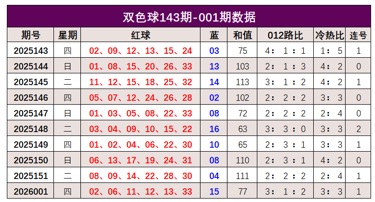 双色球第2026001开奖奖号:红球02、06、11、12、13、33,蓝球15。红球和值77,012路比3:1:2,冷热比3:3,开出1组连号。