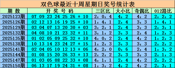 奇偶分析:上周日第25150期奇偶比为4:2,奇数红球大热,本期关注红球奇偶比号码持平,参考奇偶比3:3。
