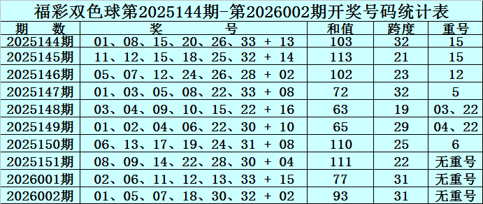双色球第2026002期奖号开出:01、05、07、18、30、32 + 02,红球号码和值开出93,跨度开出31,开出重号0个:无重号。蓝球为2路号码。