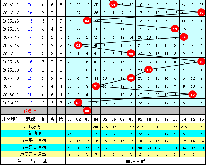 遗漏分析:最近7期红球遗漏总值分别为:19、18、42、42、23、19、29,开出4个遗漏值9以上的冷码红球,目前红球遗漏值9以上的冷码红球有5个:16、21、23、27、29,本期不看好这几个冷码,预计继续轮空。