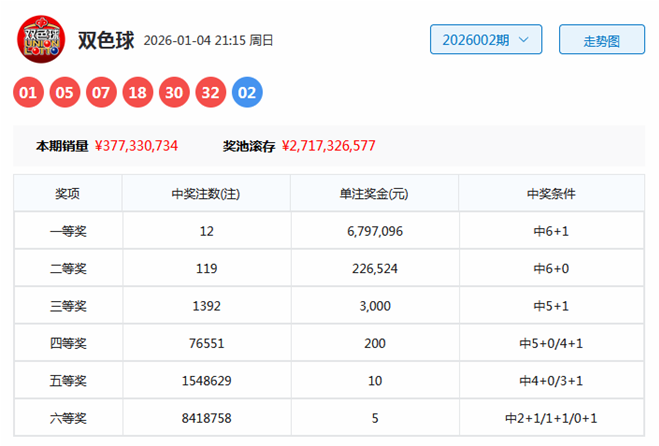 开奖回顾:双色球第2026002期奖号为:01 05 07 18 30 32 + 02,其中红球号码奇偶比为3:3,大小比为3:3,012路比为2:2:2,三区比为3:1:2。
