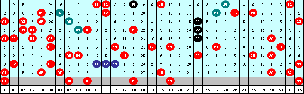 2、凤尾分析:最近十期凤尾号码分布在22-33区间,出现范围较广,凤尾在29两端次数比为8:2,凤尾出现在29以上表现活跃,本期继续关注29以上凤尾,参考号码33。
