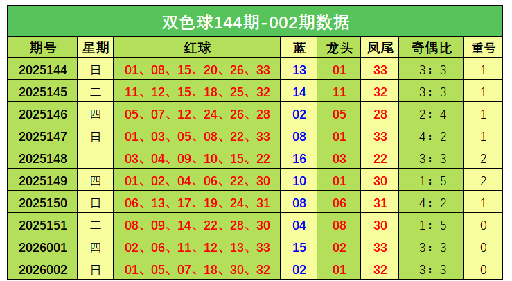 双色球第2026002开奖奖号:红球01、05、07、18、30、32,蓝球02。龙头01,凤尾32,奇偶比3:3,未开出重号。