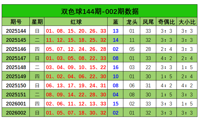 双色球第2026002开奖奖号:红球01、05、07、18、30、32,蓝球02。红球龙头01,凤尾32,奇偶比为3:3,大小比3:3。蓝球开出02。