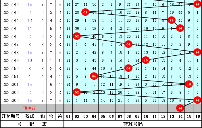 蓝球分析:上期蓝球为大号16,最近10期大小蓝球号码分别出现5次,走势相当,本期蓝球关注大号,推荐号码14。