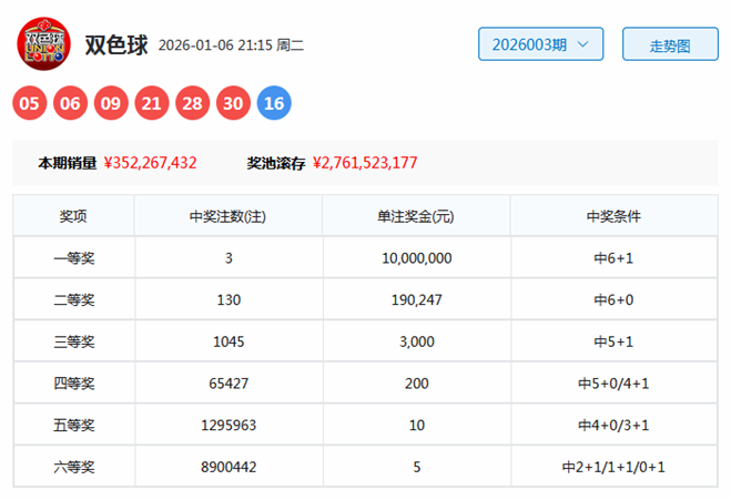 双色球第2026003期开出奖号为05、06、09、21、28、30+16。其中红球号码奇偶比为3:3,三区比为3:1:2,大小比为3:3,蓝球开出偶数号码16。