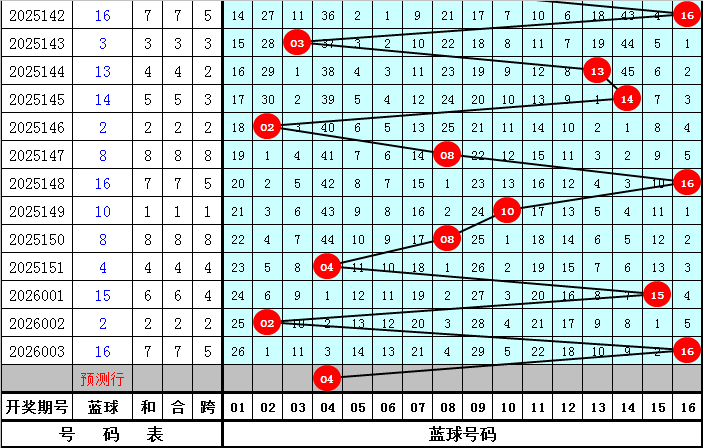 蓝球分析:上期蓝球落在第四区号码16,最近50期四区蓝球落号个数比为13:13:13:11,四区蓝球出现较少,本期预计蓝球出现在第一区,精选蓝球04。
