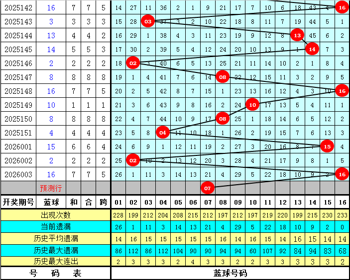 蓝球分析【一区01-04,二区05-08,三区09-12,四区13-16】:上期蓝球为16,出现在第四区,近50期区间比为13:13:13:11,近10期区间比为3:2:1:4,本期预计蓝球出现在第二区,推荐蓝球07。
