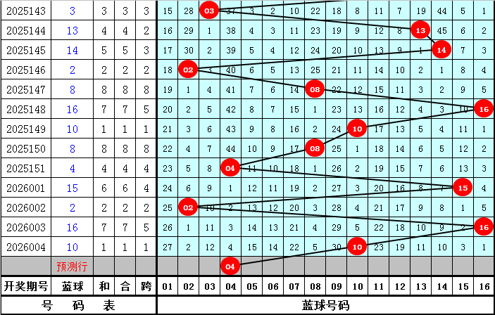 蓝球号码分析:最近30期蓝球号码质合比为12:18,最近10期蓝球质合比为2:8,最近5期蓝球分别为:04、15、02、16、10,本期蓝球关注合数号码,参考蓝球号码04。