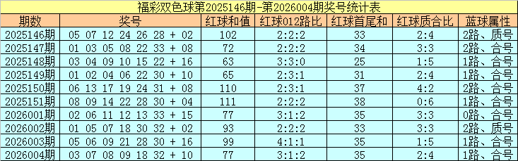 福彩双色球第2026004期红球奖号为:03、07、08、09、18、32,蓝球奖号为:10,其中红球和值为77,012路比为3:1:2,首尾和为35,质合比为2:4,蓝球属性为1路、合号。