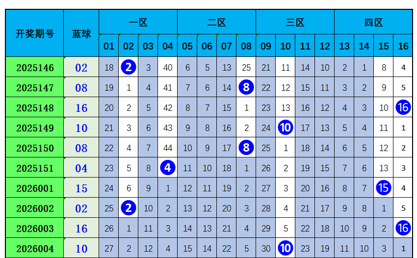 上期开出蓝球号码10,近10期,一区开出3次,二区开出2次,三区开出2次,四区开出3次,总体走势:二区、三区表现较冷,本期看好蓝球号码:06。