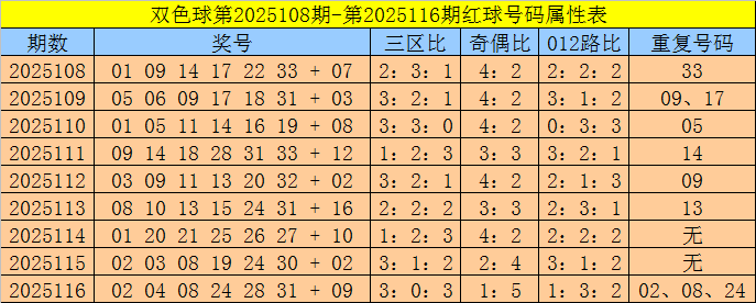 福彩双色球第2025116期奖号为:02 04 08 24 28 31 + 09,红球奇偶比为1:5,三区比为3:0:3,012路比为1:3:2,重号:02、08、24。