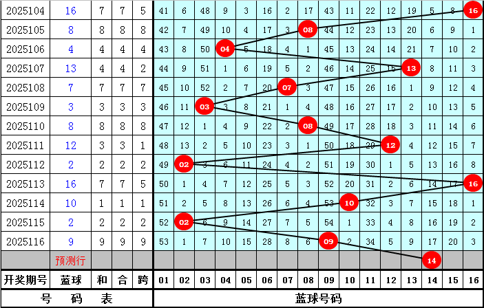 蓝球号码:最近9期分别开出蓝球号码07、03、08、12、02、16、10、02、09,蓝球号码012路个数比为3:3:3,其中0路蓝球开出最少,本期可以放弃,参考蓝球02、05、11、14。