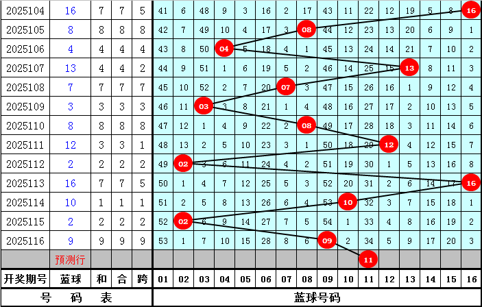 前9期开出8个蓝球号码,蓝球以冷码为主,热码蓝球开出相对较少,还没有出现的蓝球为:01、04、05、06、11、13、14、15,共8个,本期防蓝球为冷码,遗漏值较大,参考蓝球号码11。