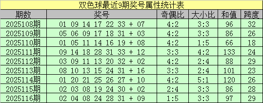双色球上期第2025116期奖号为02 04 08 24 28 31 + 09,红球号码奇偶比为1:5,大小比为3:3,和值为97,跨度:29。