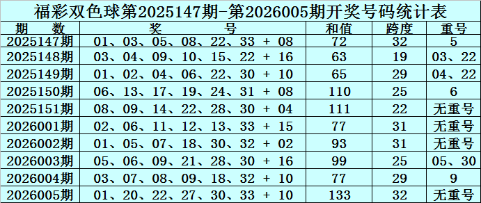 双色球第2026005期奖号开出:01、20、22、27、30、33 + 10,红球号码和值开出133,跨度开出32,开出重号0个:无重号。蓝球为1路号码。
