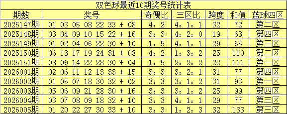 南华天第2026006期双色球区间号码个数统计分析:(红球:01-11为一区,12-22为二区,23-33为三区;蓝球:01-04为一区,05-08为二区,09-12为三区,13-16为四区)