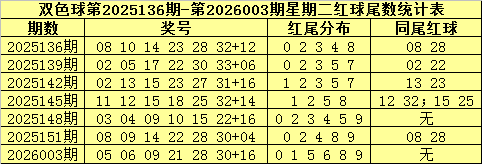 第五六位红尾分析:最近7周星期二第五六位红尾分别开出:03、82、03、71、52、52、80,其中尾数0-9开出频次分别为:尾数0出现3次,尾数1出现1次,尾数2出现3次,尾数3出现1次,尾数4出现0次,尾数5出现2次,尾数6出现0次,尾数7出现1次,尾数8出现3次,尾数9出现0次,本周星期二第五六位尾数注意7-1组合出现。