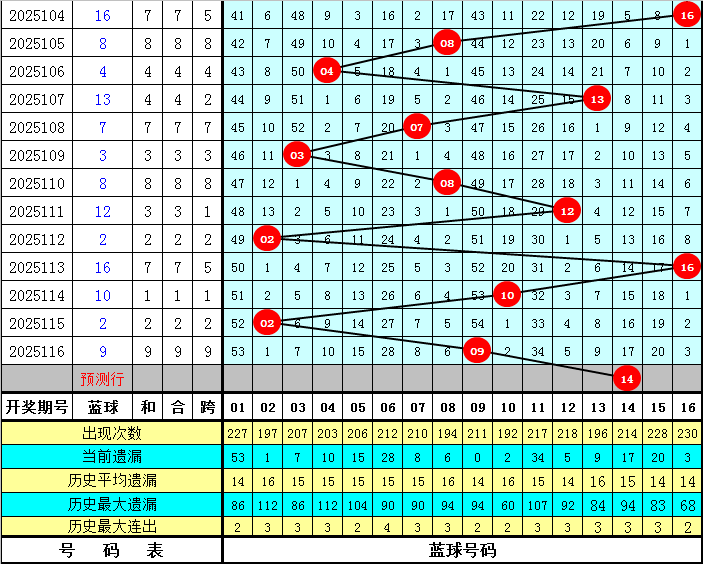 蓝球分析(定义:01-04为一区,05-08为二区,09-12为三区,13-16为四区):上期蓝球开出三区号码09,最近10期蓝球四区落号比为3:2:3:2,总体上各区蓝球走势基本平衡,本期蓝球看好在第四区开出,独蓝参考14。