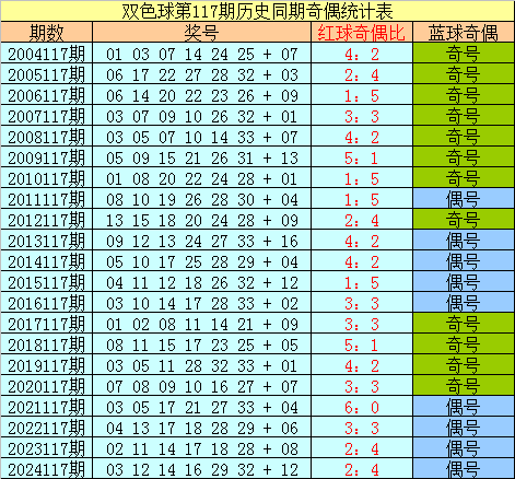 蓝球分析:在第117期历史同期开奖中,蓝球号码奇偶比为12:9,最近5年同期奇偶走势为:奇、偶、偶、偶、偶,今年同期看好开出奇数蓝球,参考号码07。