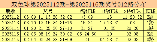 开奖回顾:双色球第2025116期开出奖号:02 04 08 24 28 31 + 09。其中,红球号码012路比为1:3:2,其中1路号码表现活跃。蓝球号码为0路号码。