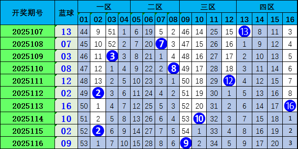 上期蓝球开出奇数号码09。近期奇偶球比值4:6,偶数球走势上升,本期看好偶数球热出,推荐号码16。