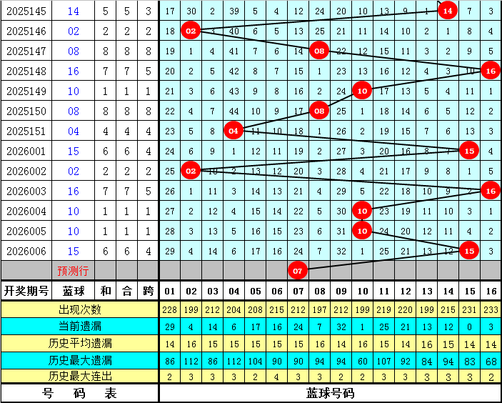 遗漏分析:最近7期红球遗漏总值分别为:23、19、29、26、12、34、28,开出5个遗漏值9以上的冷码红球,目前红球遗漏值9以上的冷码红球有4个:16、25、26、29,本期注意冷码解冻,参考红球号码16、29。