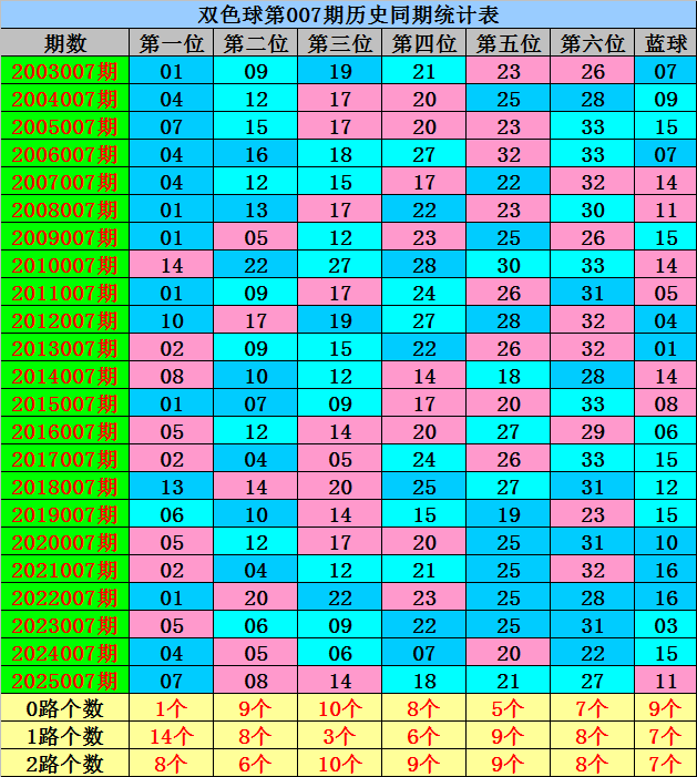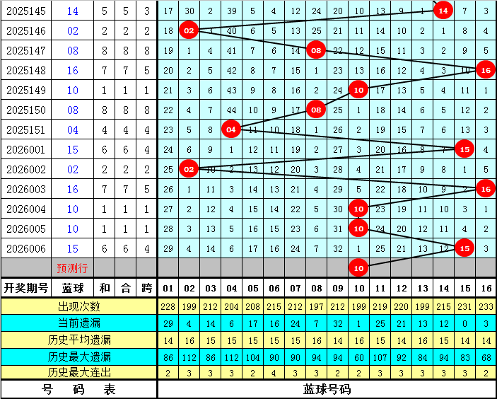 蓝球:历史同期0路号开出:03、06、09、12、15;1路号开出;01、04、07、10、16;2路号开出;05、08、11、14,蓝球012路个数比为9:7:7,当前1路号历史同期轮空3年,今年同期注意1路号出现,参考号码10。