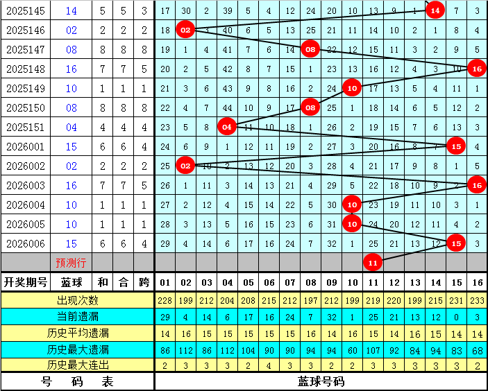 蓝球分析:上期蓝球开出号码15,上升5个点位,最近10期蓝球号码升平降分别为:升、降、降、降、升、降、升、降、平、升,本期看好蓝球下降,独蓝参考11。