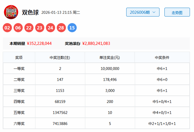 双色球第2026006期开出奖号:红球02、06、22、23、24、28,蓝球15。当期红球三区比为2:1:3,奇偶比为1:5,和值为105,跨度为26,蓝球在第四区开出。