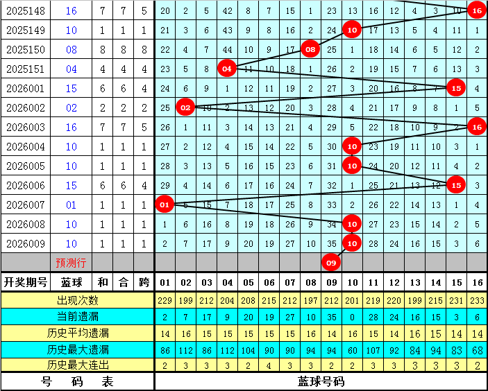 蓝球走势分析:上周四第26007期蓝球开出号码01,最近十周星期四蓝球号码大小比为4:6,奇偶比为6:4,012路比为4:3:3。本期蓝球建议侧重奇数号码,参考蓝球09、11。
