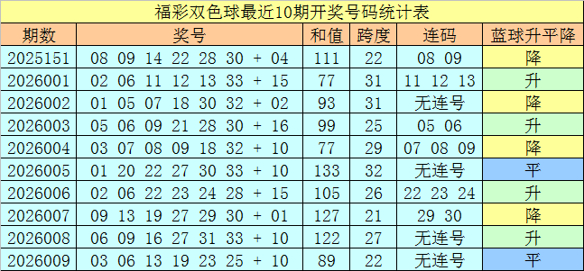 上期开奖:福彩双色球第2026009奖号开出:03 06 13 19 23 25 + 10,红球号码和值为89,首尾间距为22,无连号。