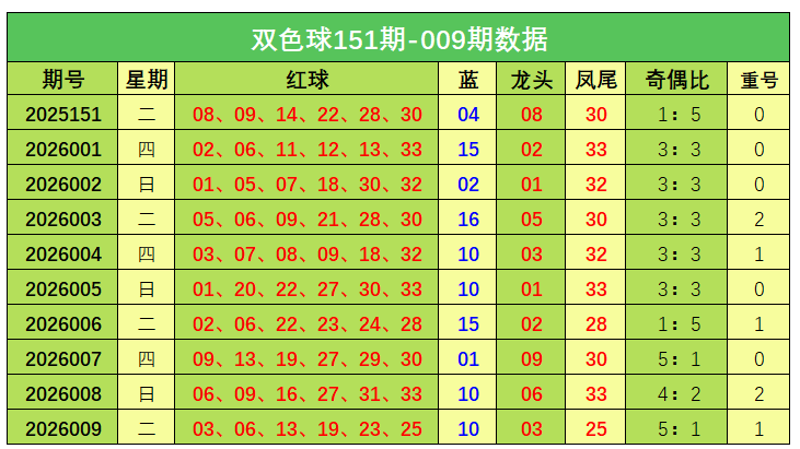双色球第2026009开奖奖号:红球06、09、16、27、31、33,蓝球10。龙头06,凤尾33,奇偶比4:2,开出2枚重号。