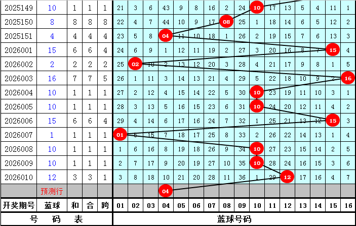 双色球第2026010期奖号为:04 09 10 15 19 26+12,红球号码012路比为2:3:1,蓝球为0路号码。