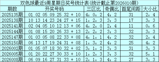 上期开奖:福彩双色球第2026010期奖号为:04 09 10 15 19 26 + 12,其中红球三区比为3:2:1,奇偶比为3:3,首尾间距为22,大小比为2:4。