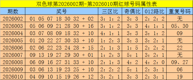 福彩双色球第2026010期奖号为:04 09 10 15 19 26 + 12,红球奇偶比为3:3,三区比为3:2:1,012路比为2:3:1,重号:19。
