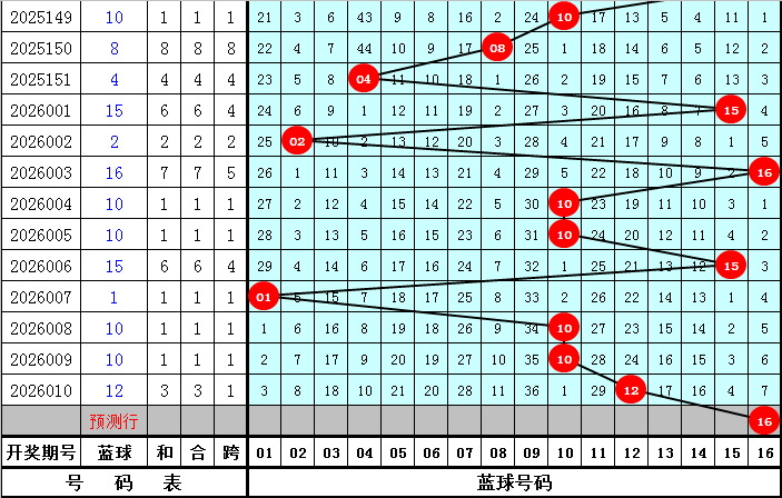 蓝球号码:最近9期分别开出蓝球号码02、16、10、10、15、01、10、10、12,蓝球号码012路个数比为2:6:1,其中2路蓝球走势最冷,本期排除2路蓝球,关注蓝球01、10、13、16。