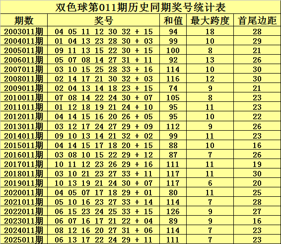 最大跨度推荐:在第011期历史同期开奖中,红球最大跨度全部在6-18之间开出,今年同期适当关注10附近的最大跨度开出。