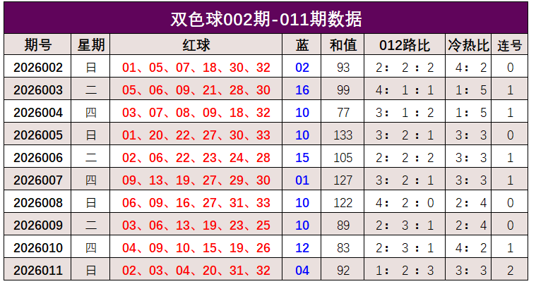 双色球第2026011期开奖奖号:红球02、03、04、20、31、32,蓝球04。红球和值92,012路比1:2:3,冷热比3:3,开出2组连号。