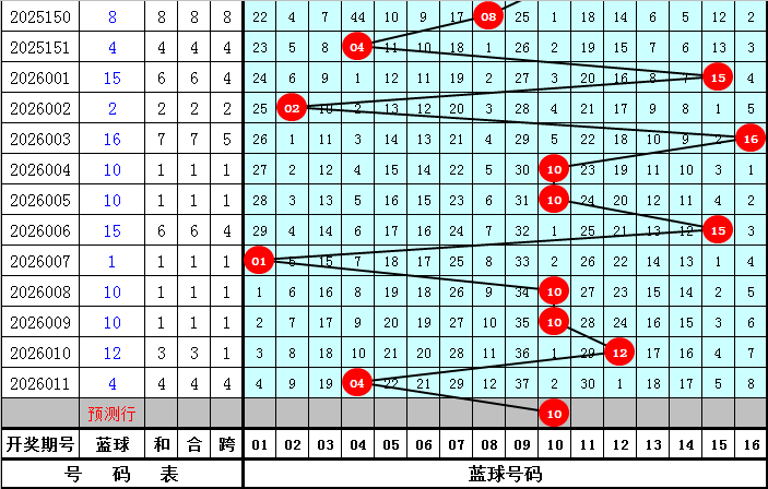 蓝球分析:第2026011期开出蓝球04,最近10期蓝球号码遗漏期数分别为:6期、5期、5期、0期、4期、29期、2期、0期、24期、10期,第2026012期蓝球注意02-16段出号,重点关注1路蓝球,参考蓝球:10。